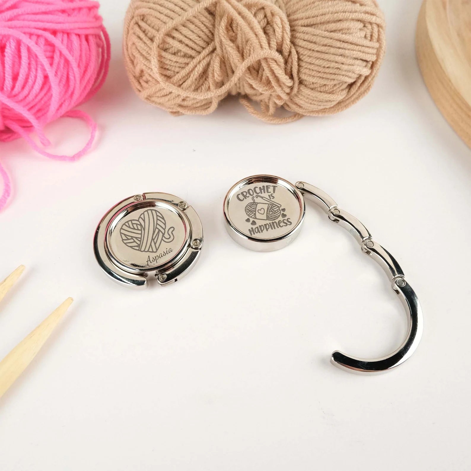 Vielseitig einsetzbar: Der Haken eignet sich nicht nur für Handtaschen – auch Kopfhörer, Regenschirme und andere kleine Gegenstände finden hier sicheren Halt. Und mit Ihrer persönlichen Gravur wird er zu einem einzigartigen Geschenk oder einem stilvollen Begleiter für den Alltag.