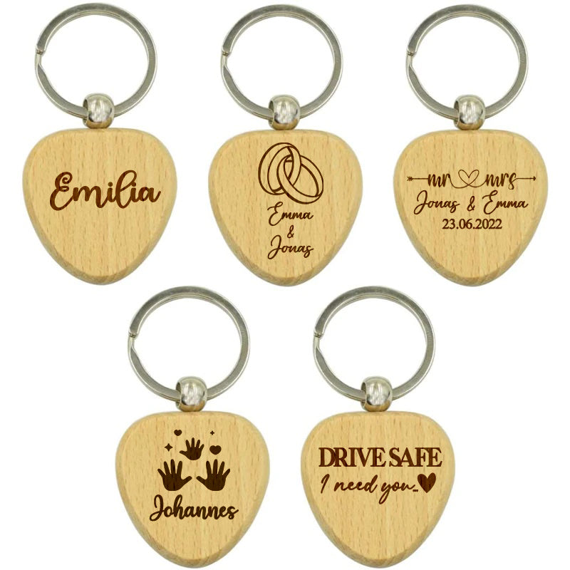 Schenke jemanden eine ganz besondere Freude mit einem gravierten Schlüsselanhänger aus Holz in Herzform.