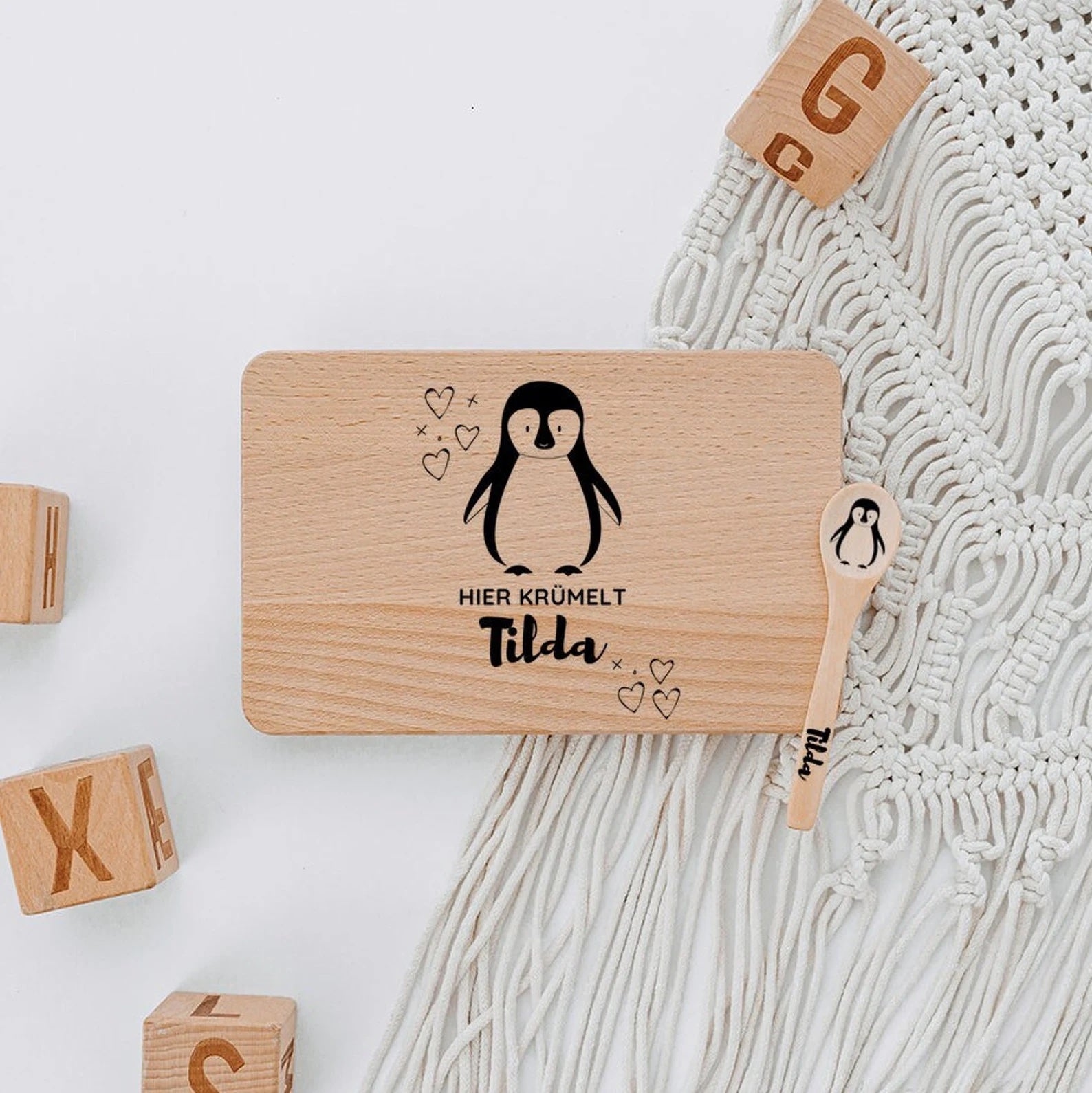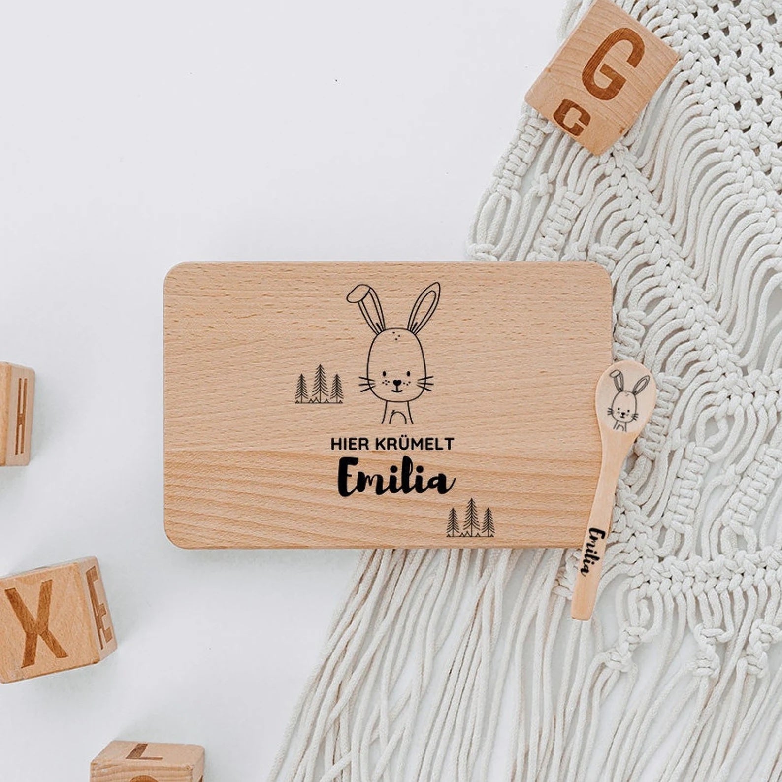 Personalisiertes Frühstücksbrettchen für Kinder mit passendem Kinderlöffel.